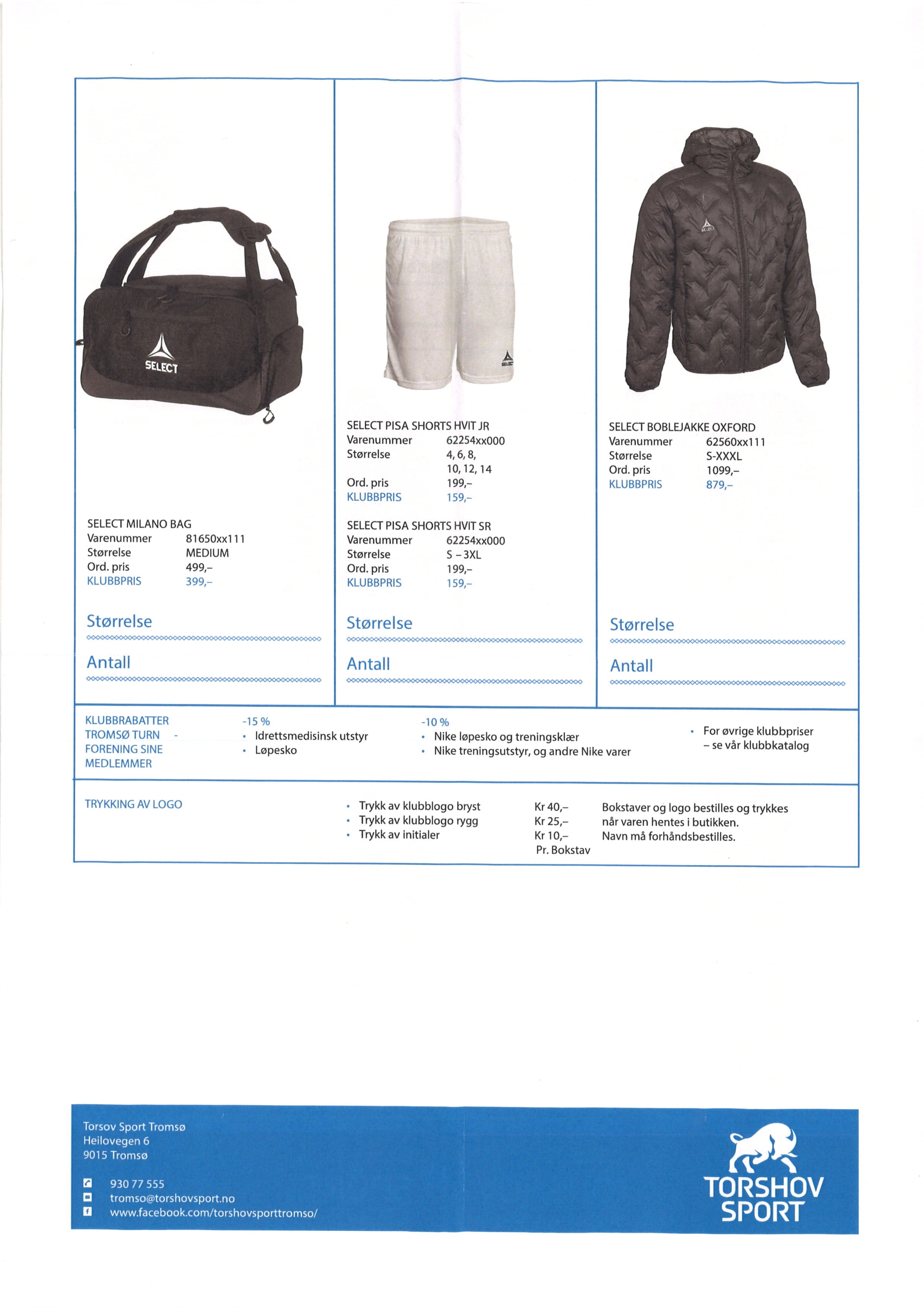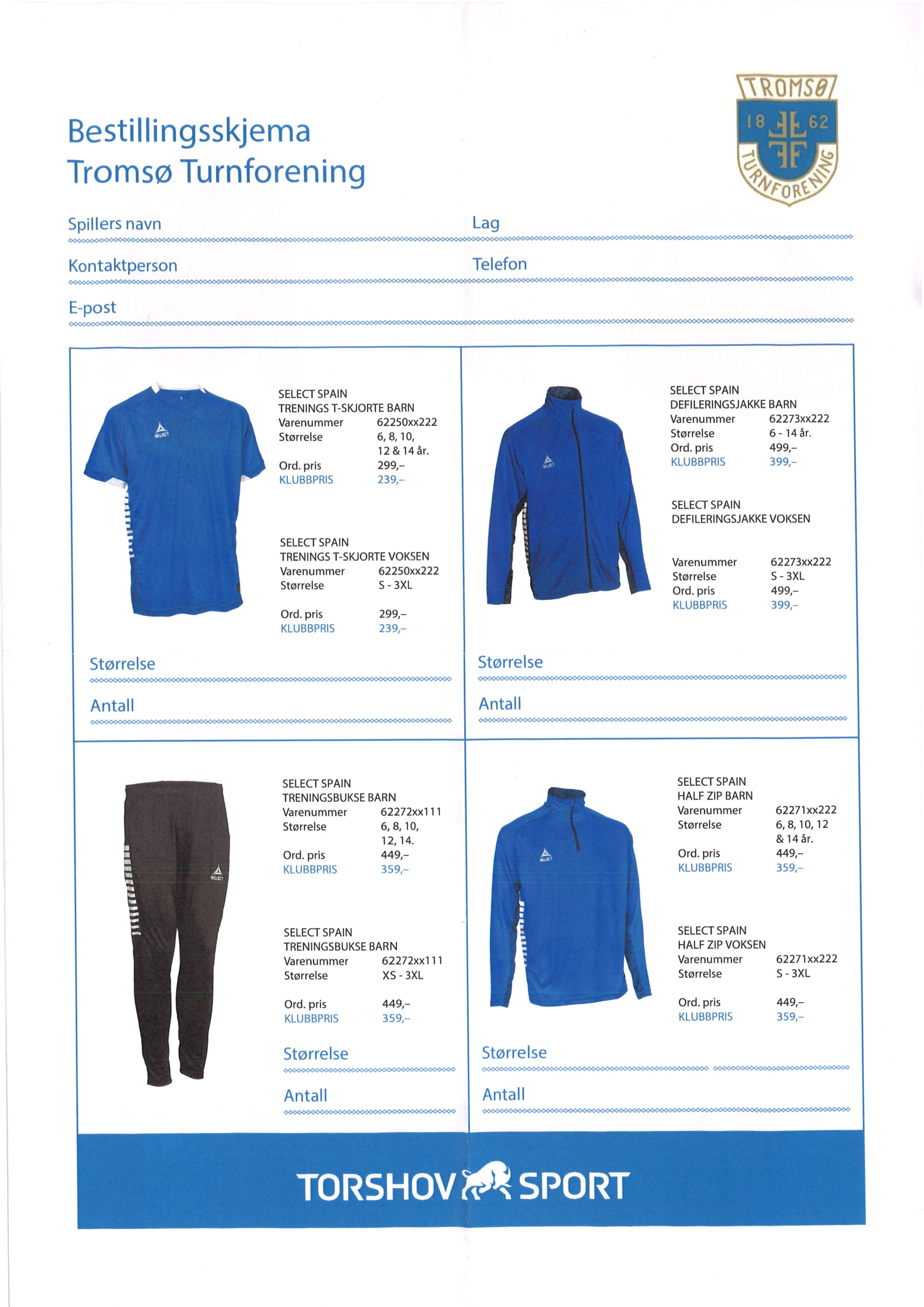 Via Select så samarbeider vi med Torshov Sport ned ved Jekta. Her får alle våre medlemmer 20 % rabatt på alt av Select utstyr. Vedlagt ligger bilder med priser på jakker, bukser og T-shirt som er vår kolleksjon. Husk å nevn TTF ved kjøp for å få rabatten på 20 %. Skriv gjerne ut vedlagte bestillingsskjema ved bestilling.